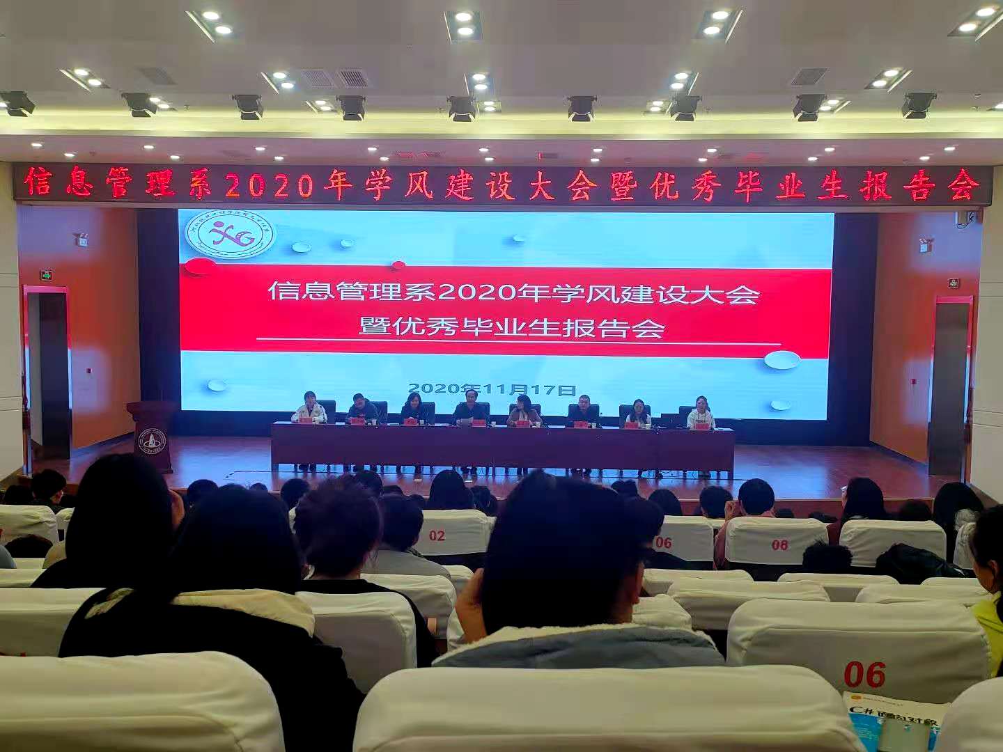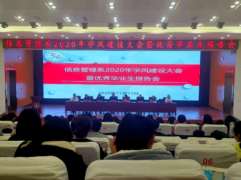 11月17日下午,信息管理系在報告廳召開了2020年學風建設暨優秀畢業生報告會,信息管理系(圖書館)黨總支書記杜占江,系主任溫秀梅,圖書館館長申靜等出席會議,信息管理系優秀畢業生史雙雙、劉佳航、閆欣茹應邀返校作報告。會議由系學工辦主任史海嫣主持,信息管理系全體學生參加會議。