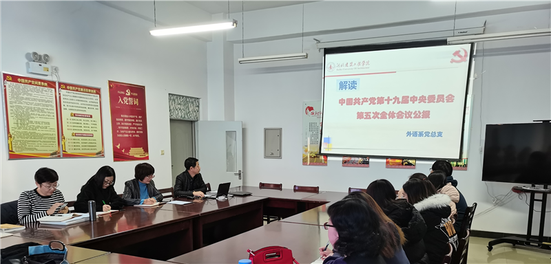 2020年11月24日下午,外語系召開解讀《中國共產黨第十九屆中央委員會第五次全體會議公報》會議,趙有江書記做解讀報告,全體師生黨員參加。會議由王培婷副書記主持。