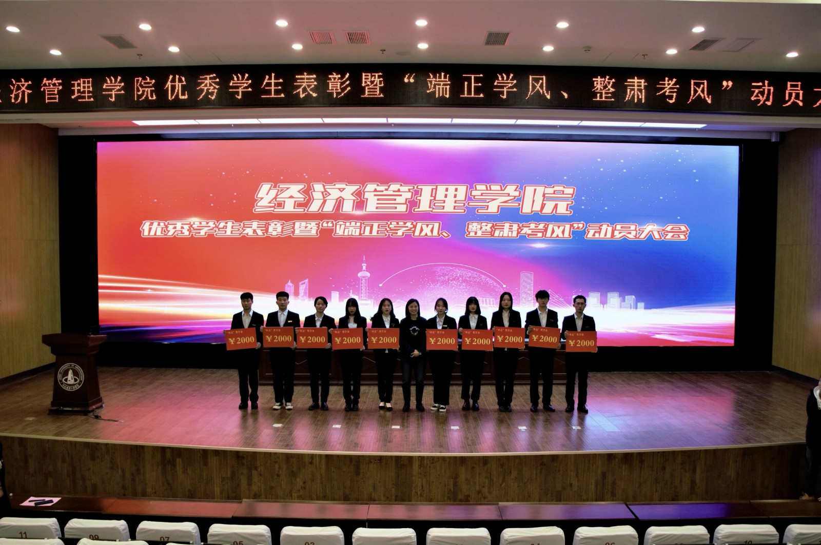 會上,經濟管理學院黨委書記鄧大鵬宣讀表彰決定,參會領導為我院優秀班集體及個人頒獎,獎項涵蓋先進班集體、國家獎學金、省級三好學生和十佳大學生、抗疫優秀志愿者、“平川”獎學金、“貝殼”獎學金、“挑戰杯”創業大賽、學科競賽以及優秀退伍大學生等九項。各項獲獎學生代表進行經驗交流與分享。學生工作辦公室主任孫賀娟作經濟管理學院學情分析報告。接著學生簽訂并跟讀誠信應考承諾書。