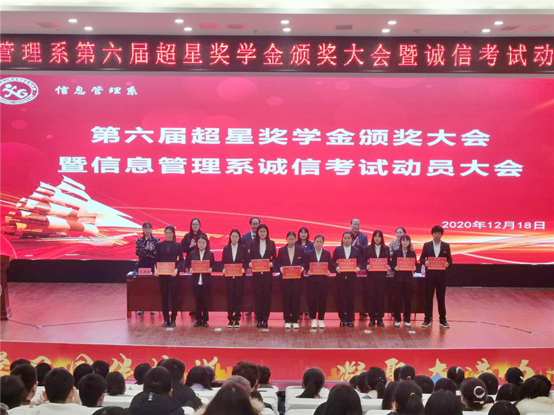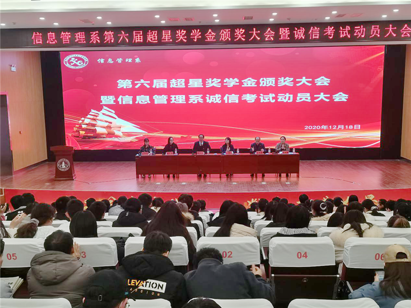 12月18日下午,信息管理系第六屆超星獎(jiǎng)學(xué)金頒獎(jiǎng)暨誠(chéng)信考試動(dòng)員大會(huì)在新能源報(bào)告廳隆重召開。出席本次會(huì)議有信息管理系黨總支書記杜占江、信息管理系主任溫秀梅、教研室主任康麗峰、王海東,以及超星公司經(jīng)理段志雪。會(huì)議由信息管理系學(xué)工辦主任史海嫣主持,信息管理系全體學(xué)生參加。