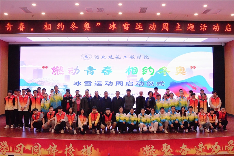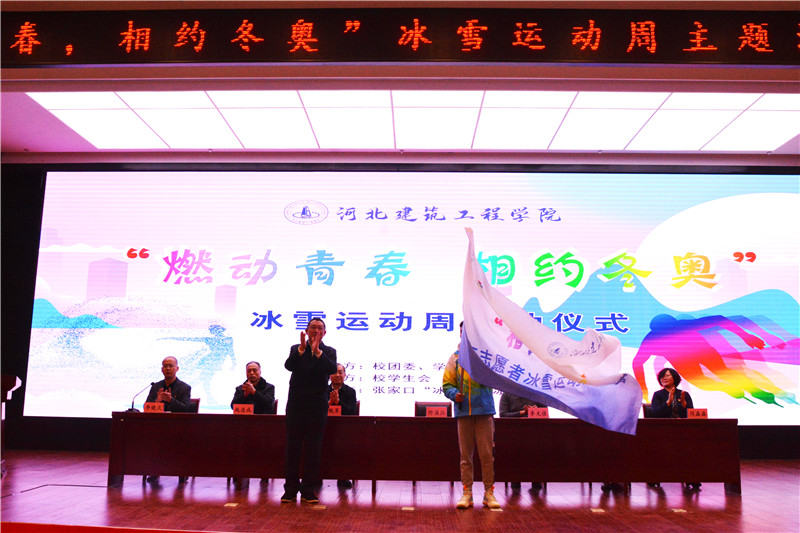 為深入學習貫徹習近平同志關于籌辦2022年冬奧會和發展冰雪運動的重要指示精神,全力做好冬奧會“館校對接”志愿者練兵備戰工作,推動冰雪運動知識和技能在師生中的普及,提高師生的健康素養,增進師生志愿者之間的情誼,增強志愿服務團隊的凝聚力和戰斗力,12月17日下午,由校團委、學生處、校工會、體育部聯合舉辦的“燃動青春 相約冬奧”冰雪運動周活動啟動儀式在新能源交流中心舉行。校長師涌江、高新城投總經理(張家口冰之夢滑冰場負責人)李文佳、校工會常務副主席喬銳軍、學生工作處處長孫彬、體育部黨總支書記趙連成、體育部主任閆磊磊及師生代表300余人參加儀式,儀式由校團委書記李曉慶主持。