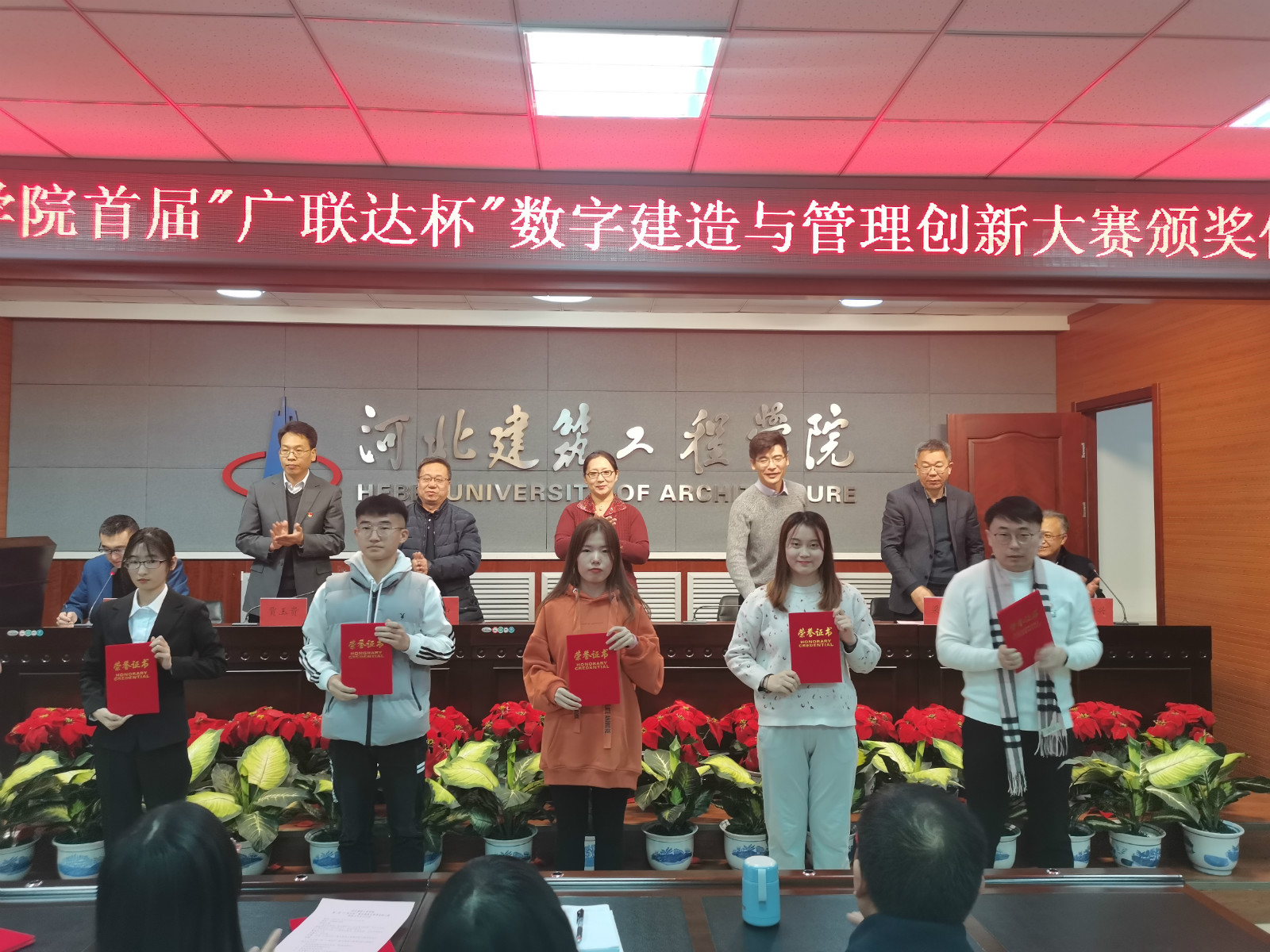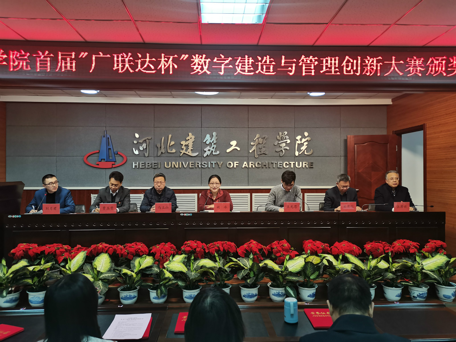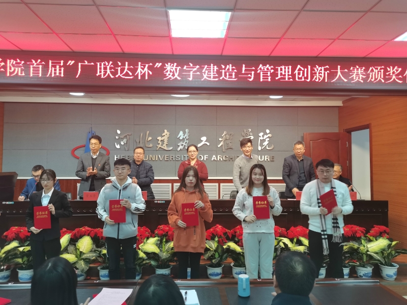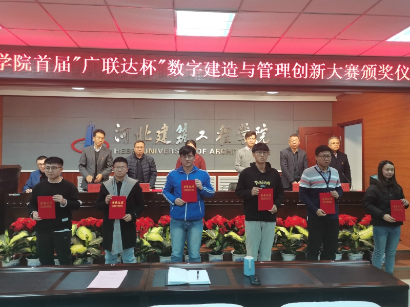 2020年12月8日,我校在崇德樓A306舉辦了首屆“廣聯(lián)達(dá)杯”數(shù)字建造與管理創(chuàng)新大賽頒獎儀式。據(jù)悉,此次大賽于今年4月份開始籌備,經(jīng)過網(wǎng)上報名、培訓(xùn)、提交作品和評審等環(huán)節(jié),歷時四個月,于7月底完成。我校建藝、土木、電氣、經(jīng)管、能源、市政與環(huán)境等6個院系的388名學(xué)生(本科生+研究生)報名參賽,共有63項作品獲獎,其中一等獎11項、二等獎20項、三等獎32項。學(xué)校副校長姚冰、廣聯(lián)達(dá)科技股份有限公司華北大區(qū)總經(jīng)理王光思、研究生處處長馬立山、教務(wù)處處長梁建明、科研處處長賈玉貴以及經(jīng)管學(xué)院院長張國興作為頒獎嘉賓出席了頒獎儀式。本次會議由經(jīng)管學(xué)院副院長劉月君主持。