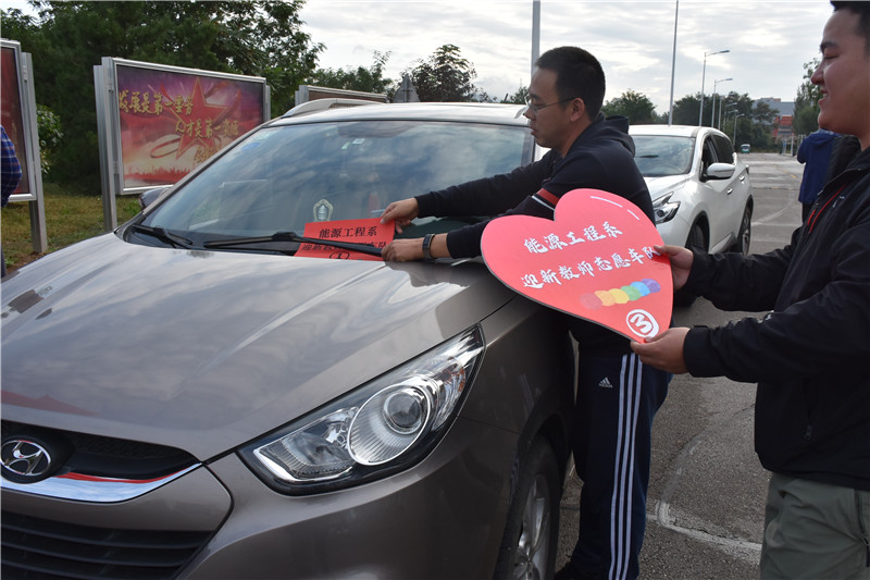 早上8點,我系教師志愿服務車隊全部集合完畢,整裝待發,準備為同學們隨時提供服務。我系在學校門口、主教學樓門口、宿舍樓四號樓和七號樓樓下,設置了迎新志愿服務點,學生一進入校門,由學生志愿者幫助新生搬運行李,有序引導至教師迎新志愿車上。由老師駕車,安全、有序地護送到宿舍區志愿服務點,與宿舍區的志愿者接力完成新生的宿舍入住和安頓工作。能源工程系迎新志愿服務車隊在學校大門和學生宿舍區之間來回往返,構成了新生報到現場最美的畫面。