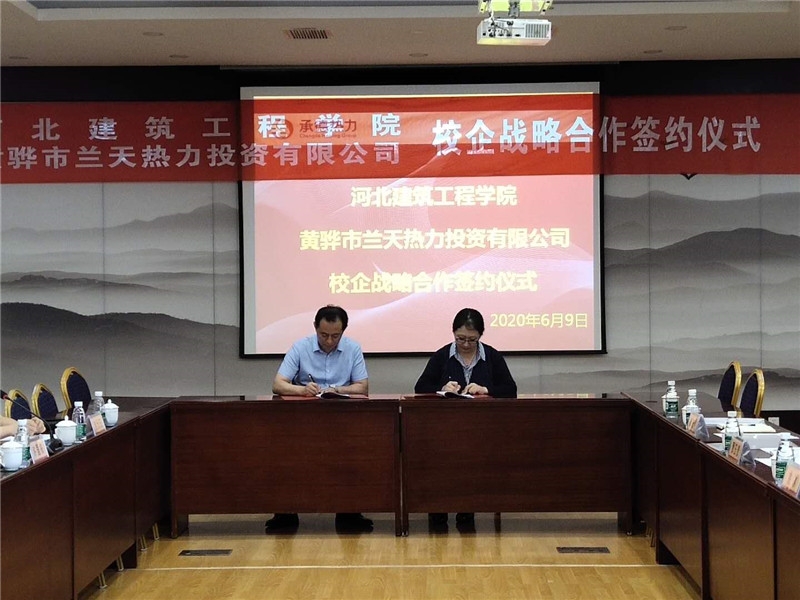 6月9日下午,2138cn太陽集團、黃驊市蘭天熱力投資有限公司校企戰略合作簽約儀式在黃驊市舉行,副校長姚冰、蘭天公司董事長郎輝分別代表雙方簽字。黃驊市人民政府副市長王友海、承德熱力集團公司副總經理許國棟,我??蒲挟a業處處長賈玉貴、研究生處處長馬立山、信息工程學院院長劉曉群、科研產業處副處長裴宏偉等參加簽約儀式。