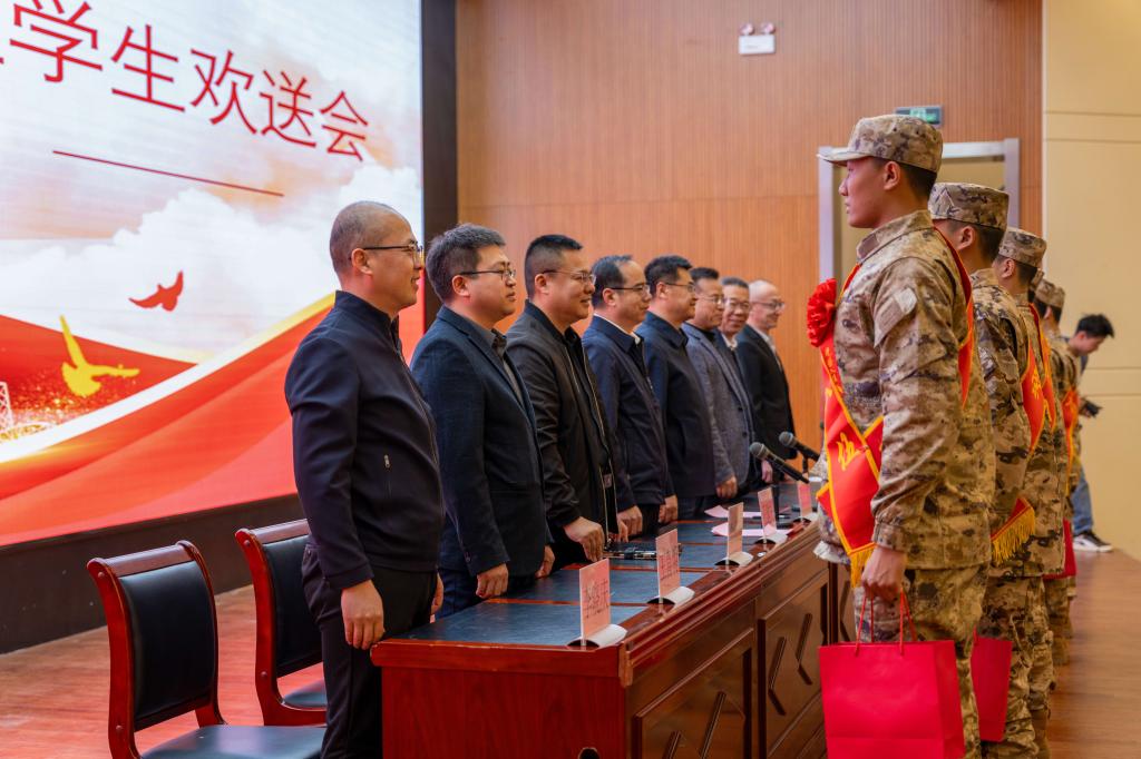 王建民代表學校及全體師生向入伍同學表示熱烈祝賀,向積極送子參軍、為國防建設貢獻力量的家長們表達崇高的敬意!他對同學們提出三點希望:一是要堅定信念,忠誠報國。忠于黨和人民,牢記軍人的使命與責任,將個人理想融入國家發展,用實際行動踐行愛國情懷。二是要錘煉意志,勇于擔當。在軍營中磨煉意志,培養吃苦耐勞的精神,勇敢面對挑戰,努力成為有責任、有擔當的優秀軍人。三是要不忘學習,全面發展。在軍營中也要保持學習的習慣,利用業余時間提升文化知識和專業技能,努力把自己培養成為有靈魂、有本事、有血性、有品德的新時代革命軍人,為實現強國夢強軍夢貢獻力量。