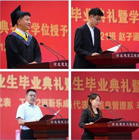 水212班胡旭東同學、造價221班趙子涵同學分別代表畢業生和在校生發言。工212班靳樂成家長靳雷剛代表畢業生家長發言,信息管理系教師馬驍代表教職工發言。