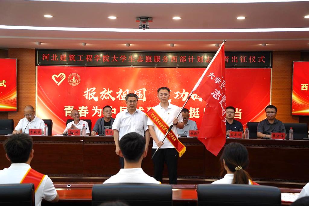 翁維素代表學校黨委為志愿服務團授旗,并宣布大學生志愿服務西部計劃志愿者正式出征。他充分肯定了14名優秀畢業生志愿者“報效祖國 建功西部”的青春抉擇,勉勵志愿者們牢記習近平總書記給謝依特小學戍邊支教西部計劃志愿者服務隊隊員回信精神,胸懷“國之大者”,做扎根西部的“筑夢人”;錘煉過硬本領,做知行合一的“實干家”;弘揚建院精神,做校地交融的“連心橋”,在西部書寫無愧于時代的青春答卷。