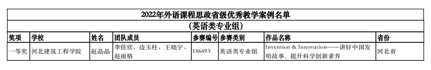 近日,由高等教育出版社、全國高校教師網絡培訓中心與《中國外語》編輯部共同開展的“2022年外語課程思政優秀教學案例征集與交流活動”省級優秀作品獲獎名單公布,我校外語系趙晶晶、李佳欣、邊玉柱、王曉宇、趙雨格五位教師組成的團隊喜獲河北省英語專業組一等獎。