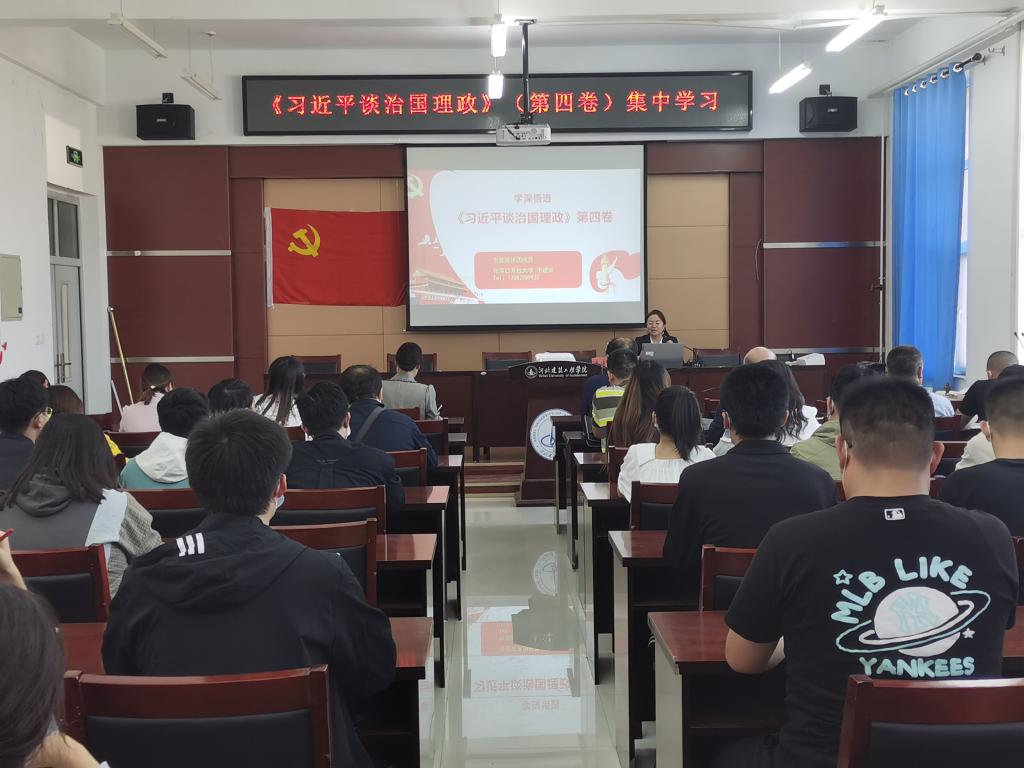 能源工程系于9月27日下午在能源樓B318會議室開展主題為“學深悟透《習近平談治國理政》(第四卷)”的集中學習活動,張家口開放大學培訓中心牛建麗主任受邀擔任主講人,能源工程系黨總支副書記秦景主持會議,全系師生黨員參加會議并進行集中學習。