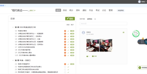 11月底,數(shù)理系面向全體師生創(chuàng)建了學(xué)習(xí)通平臺(tái)“相約奧運(yùn)——扛紅旗,當(dāng)先鋒”專項(xiàng)課程,課程分為四部分:介紹2022冬奧會(huì)知識(shí)介紹,冬奧—張家口,冬奧—2138cn太陽集團(tuán),冬奧—數(shù)理系,旨在讓全體師生了解冬奧會(huì)的知識(shí),了解冬奧會(huì)對于張家口的意義,了解大學(xué)生志愿者為冬奧會(huì)服務(wù)的真實(shí)場景,了解數(shù)理系學(xué)生支部與教工支部相約奧運(yùn)的激情。通過專項(xiàng)課程的持續(xù)學(xué)習(xí),使全體師生對冬奧會(huì)、對張家口都有了更深刻的認(rèn)識(shí)。