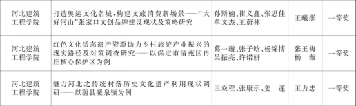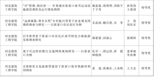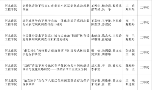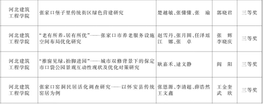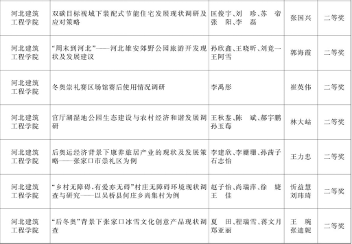 自活動開展以來,我校高度重視,積極響應上級號召,第一時間發布報名通知,組織動員全校師生踴躍申報。通知發布后,各院系師生廣泛參與,全校師生跨學院、跨專業、跨年級組隊,共收到申報課題作品246項,我校師生參賽期間進行詳細的課題論證,優化并且調整課題研究方案,全面、細致、深入地分析問題,認真討論,最終我校共33項課題準予立項、28項課題獲獎。其中,《“冷”資源,熱經濟——冬奧城市張家口冰雪運動設施建設現狀及運行情況調研》等7項課題榮獲特等獎,《京張體育文化旅游帶歷史街區更新策略研究——以大境門為例》等4項課題榮獲一等獎,《雙碳目標視域下裝配式節能住宅發展現狀調研及應對策略》等13項課題榮獲二等獎,《張家口堡子里傳統街區綠色營建研究》等4項課題榮獲三等獎,我校教師崔英偉、王苗、張博陽、姜乖妮、王力忠5人被授予“優秀指導教師”稱號。獲獎質量再創歷史新高。