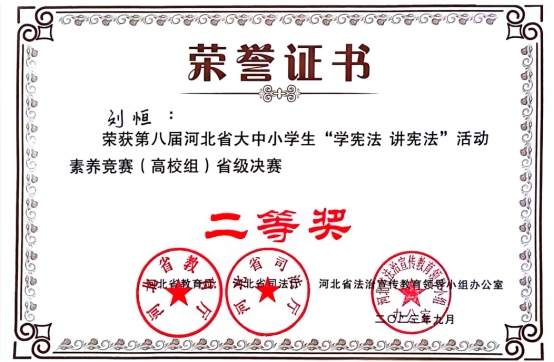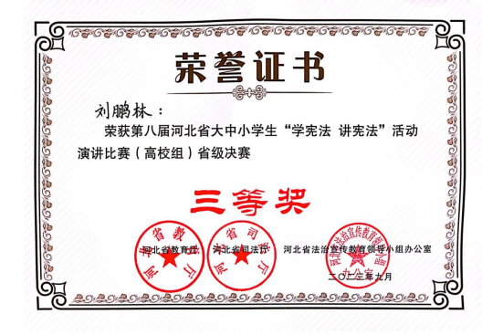 9月26日-27日,由省教育廳、省司法廳、省法治宣傳教育領導小組辦公室主辦,河北師范大學承辦的第八屆河北省學生“學憲法 講憲法”大賽在省會石家莊舉行。經過激烈角逐,我校土木工程學院工226班劉恒榮獲高校組憲法素養競賽二等獎,韓曉敏被評為優秀指導老師;經濟管理學院管212班劉鵬林榮獲演講比賽三等獎,劉格被評為優秀指導老師。