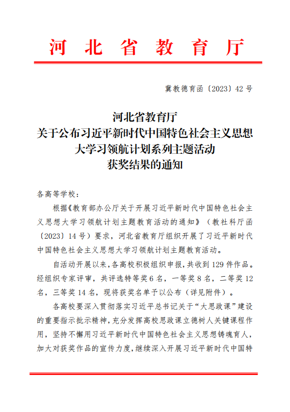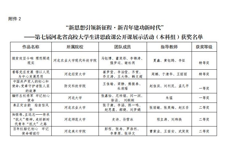 10月31日,“新思想引領新征程· 新青年建功新時代”——第七屆河北省高校大學生講思政課公開課展示活動(本科組)獲獎名單公布,我校師生作品《請黨放心 強國有我——牢記總書記囑托 在強國建設中譜寫志愿青春新篇章》斬獲省賽三等獎,并被推薦參加國賽。