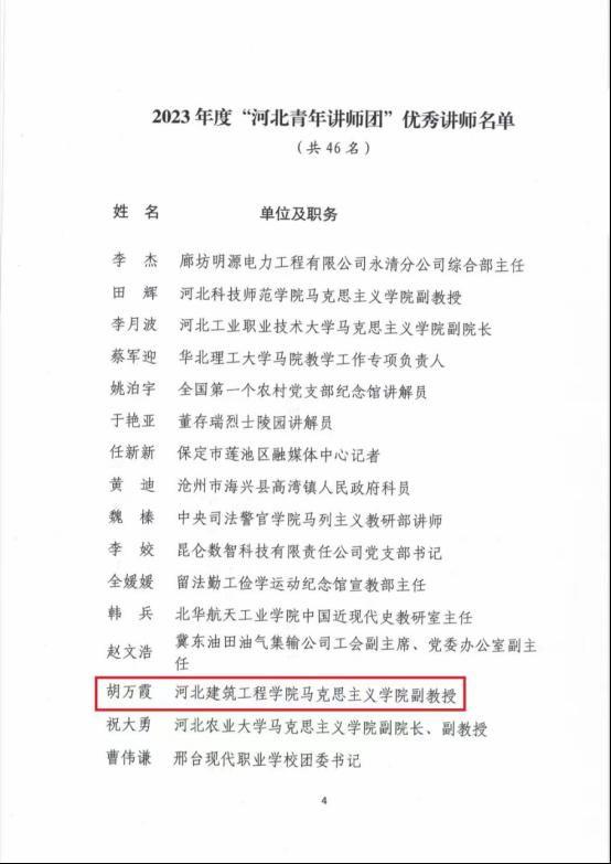 為深入學習貫徹習近平新時代中國特色社會主義思想,認真落實全團實施“青年講師團”計劃要求,2019年5月共青團河北省委組建了“河北省青年講師團”。經我校團委推薦,胡萬霞順利入選,成為首批百名講師中的一員。