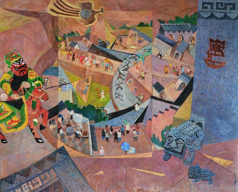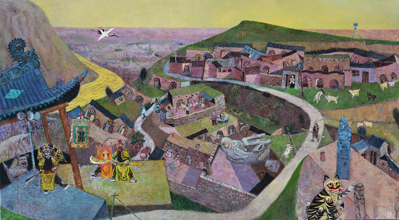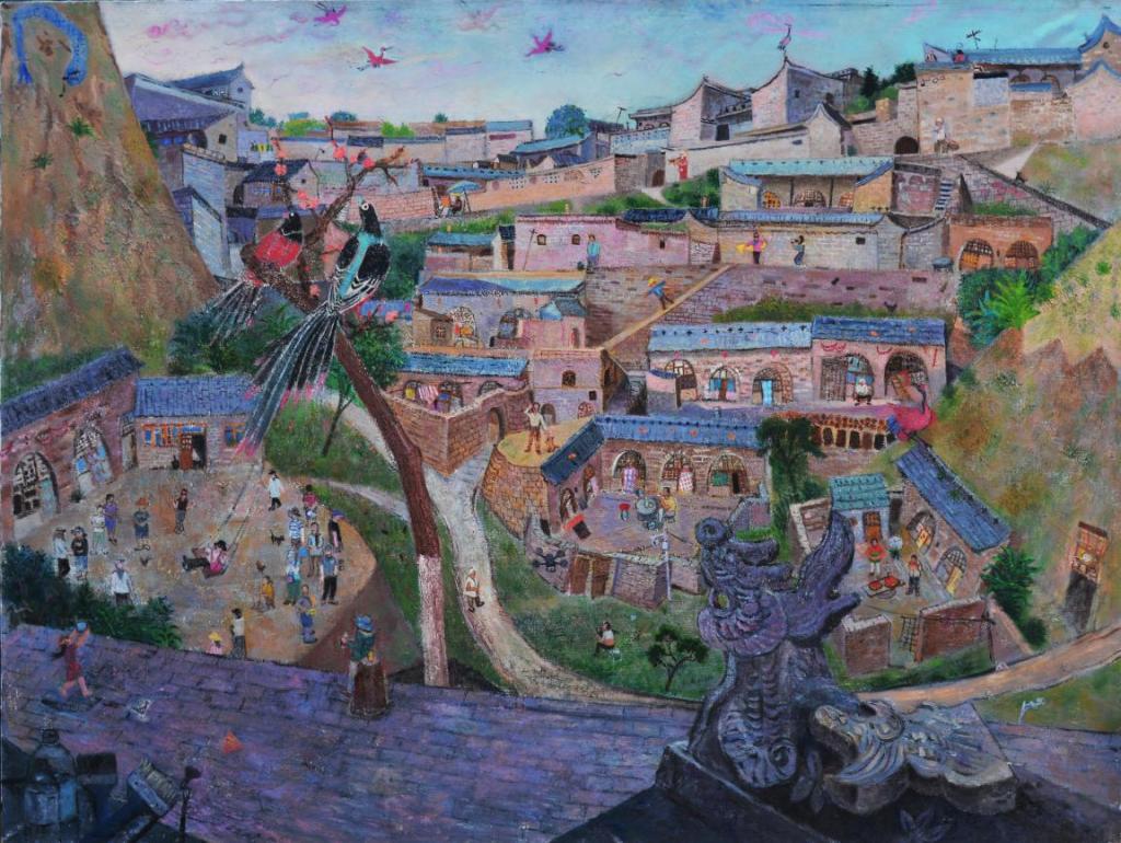 同時把現代繪畫語言的平面性、裝飾性等特征與自然風景和傳統文化相結合,表現質樸、純凈、喜慶的新鄉村題材。畫面靈活運用視點的變化,將既熟悉又夢幻的村莊、人物、云朵、樹木……都靈活、自由地展現于畫面,表達出田園牧歌的主題思想。