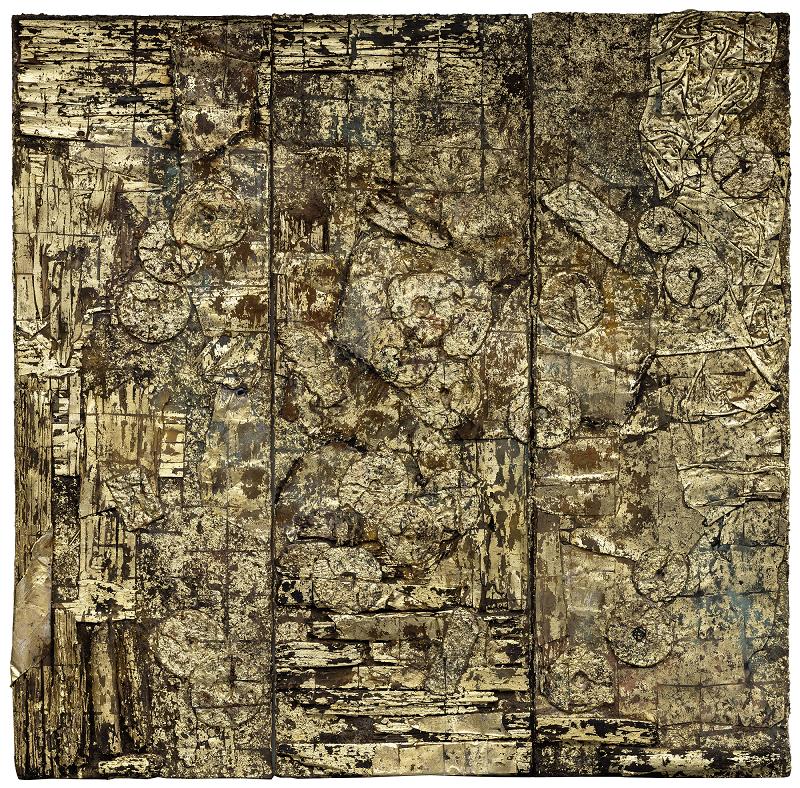 劉峻巖老師入選全國美展的作品《遠古圖景》通過材料的介入,將傳統文化中的視覺符號進行提煉和應用,并與當代的視覺審美、觀念相融合,呈現一種古典美與當代性結合的現代藝術的審美氣質。同時,在視覺上呈現出材料的斑駁肌理,使其更具有直觀的抽象語言,更好地發掘材料背后的文化屬性和文化特征,形成一種包含著文化精神內涵的視覺感知,以表達對時間和生命的情感體驗。