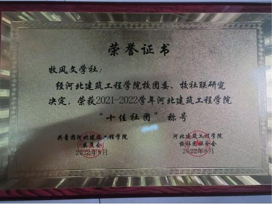 牧風(fēng)文學(xué)社,是在校團(tuán)委的領(lǐng)導(dǎo)下發(fā)展的文學(xué)類學(xué)生社團(tuán),由省作家協(xié)會會員、張家口作家協(xié)會副主席、我校教授韓仰熙老師擔(dān)任指導(dǎo)教師。牧風(fēng)文學(xué)社積極組織“原創(chuàng)征文大賽”“建院詩詞大會”等活動(dòng)。該社團(tuán)曾在2003年被評為省“雙百家”文藝社團(tuán),蟬聯(lián)多年榮獲“十佳精品活動(dòng)”和“十佳社團(tuán)”榮譽(yù)稱號,并連續(xù)多年獲得“優(yōu)秀社團(tuán)”稱號。