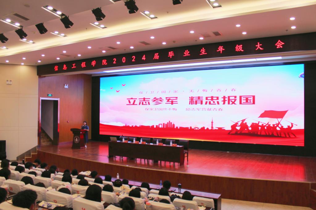 5月22日,信息工程學院在新能源報告廳召開2024屆畢業(yè)生征兵入伍動員會,學院副書記劉曉慧、學工辦主任劉曉東以及各畢業(yè)班輔導員出席會議,20級全體學生參會。會議由劉曉慧主持。