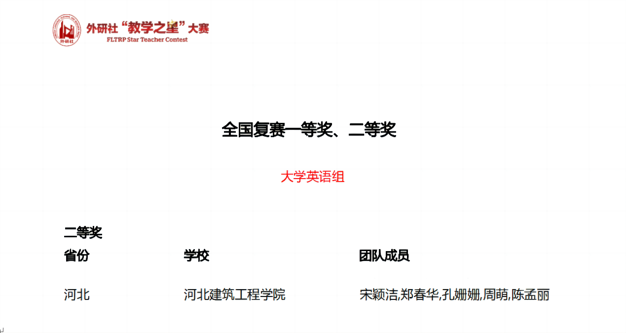 6月20日,2024年外研社“教學(xué)之星”大賽全國復(fù)賽獲獎名單揭曉,外語系再獲捷報,由宋穎潔、鄭春華、孔姍姍、周萌、陳孟麗五位老師組成的公共外語教學(xué)團隊榮獲“大學(xué)英語組”全國復(fù)賽二等獎。