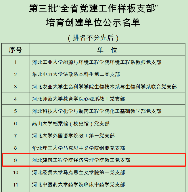 近日,中共河北省委教育工作委員會公布了全省第三批新時代高校黨建示范創建和質量創優遴選結果。我校經濟管理學院教工黨支部入選“全省黨建工作樣板支部”培育建設單位。