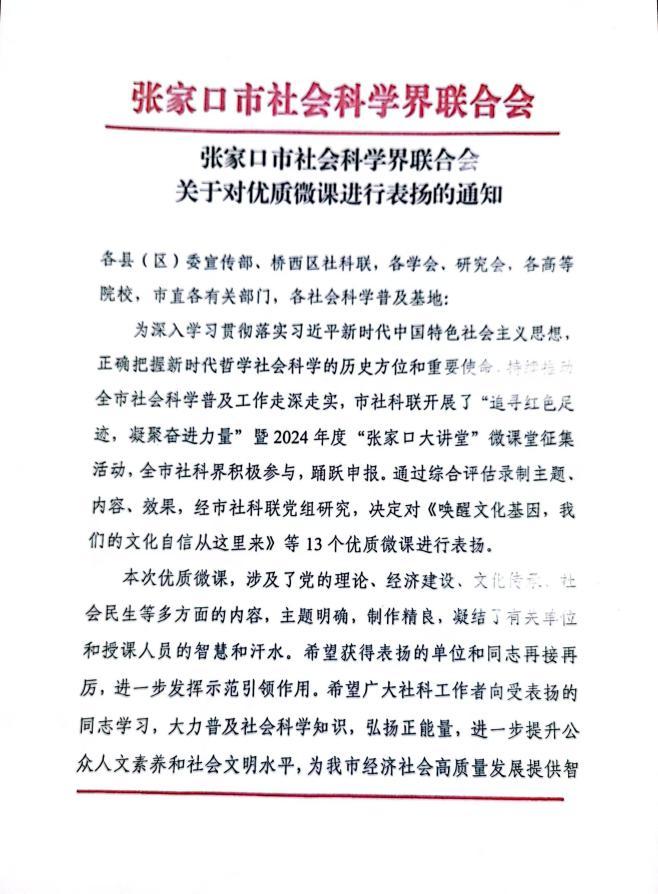 張家口市社科聯開展“追尋紅色足跡,凝聚奮進力量”暨2024年度“張家口大講堂”微課堂征集活動,我校馬克思主義學院積極參與,踴躍申報,共計提交微課作品6件。