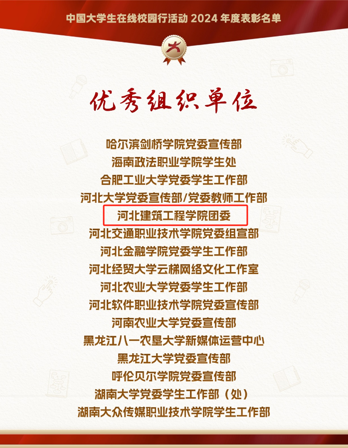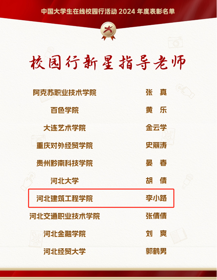 近日,教育部2024年度中國大學生在線校網通及校園行表彰榜單公布,我校在此次表彰中再創佳績,校團委榮獲“優秀組織獎”,李小路老師被評選為“校園行新星指導教師”。