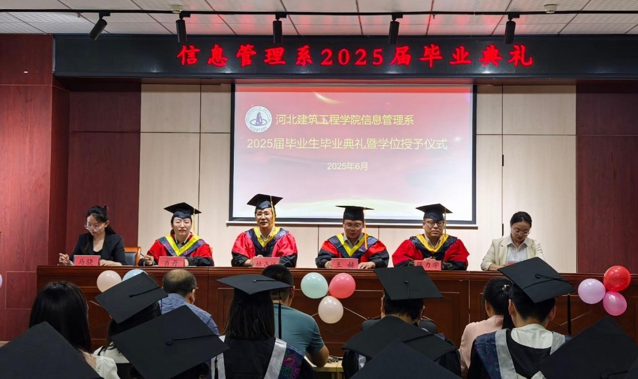 六月的鮮花掩映著畢業的歡愉,仲夏的細雨訴說著離別的愁緒,又是一年畢業季。在離別與期待交織的氛圍中,6月13日下午,信息管理系2025屆本科生畢業典禮暨學位授予儀式在圖書館培訓教室舉行。系黨總支書記兼系主任王赫,原黨總支書記杜占江,副書記張力學,副主任肖丹出席活動。畢業班輔導員馬驍主持儀式,全體教師及2025屆畢業生共同見證了這一莊嚴時刻。