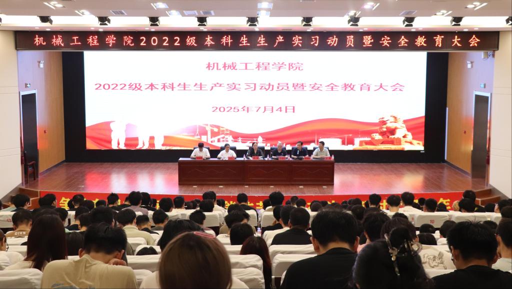 為做好2022級(jí)本科生生產(chǎn)實(shí)習(xí)工作,增強(qiáng)學(xué)生安全意識(shí),提升實(shí)習(xí)質(zhì)量,7月4日,機(jī)械工程學(xué)院在新能源交流中心召開2022級(jí)本科生生產(chǎn)實(shí)習(xí)動(dòng)員暨安全教育大會(huì)。學(xué)院領(lǐng)導(dǎo)班子成員、各專業(yè)負(fù)責(zé)人、實(shí)習(xí)指導(dǎo)教師及相關(guān)輔導(dǎo)員和2022級(jí)全體本科生參加大會(huì),副院長(zhǎng)劉春東主持會(huì)議。