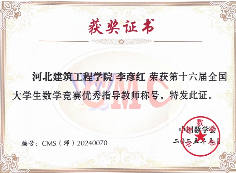 在全國大學生數學競賽的舞臺上,李彥紅老師榮獲第十六屆“優秀指導教師”榮譽稱號。這一獎項既是對教師個人指導能力的肯定,更是對數理系學科競賽育人體系的高度認可。